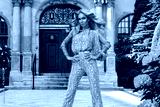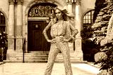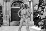 Beautiful female model in elegant suit and gold jewelry sensually walks in the city on a sunny summer day. Luxury Summer Fashion