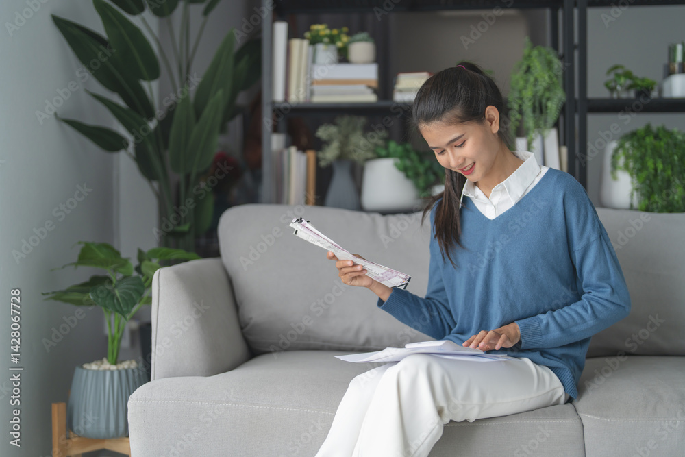 Woman calculating paper bills at home