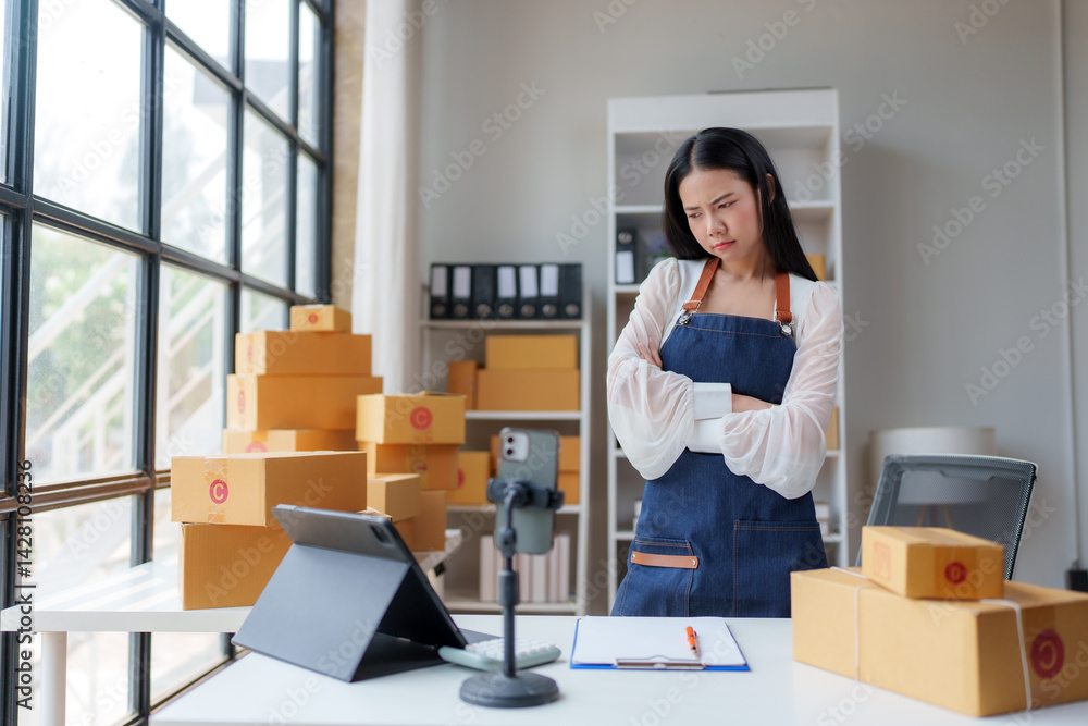 Stressed young asian businesswoman wearing apron standing with arms crossed looking at tablet with smartphone on tripod and cardboard boxes in startup office