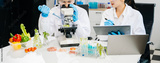 Food scientists in lab coats, testing samples, and analyzing food safety and quality