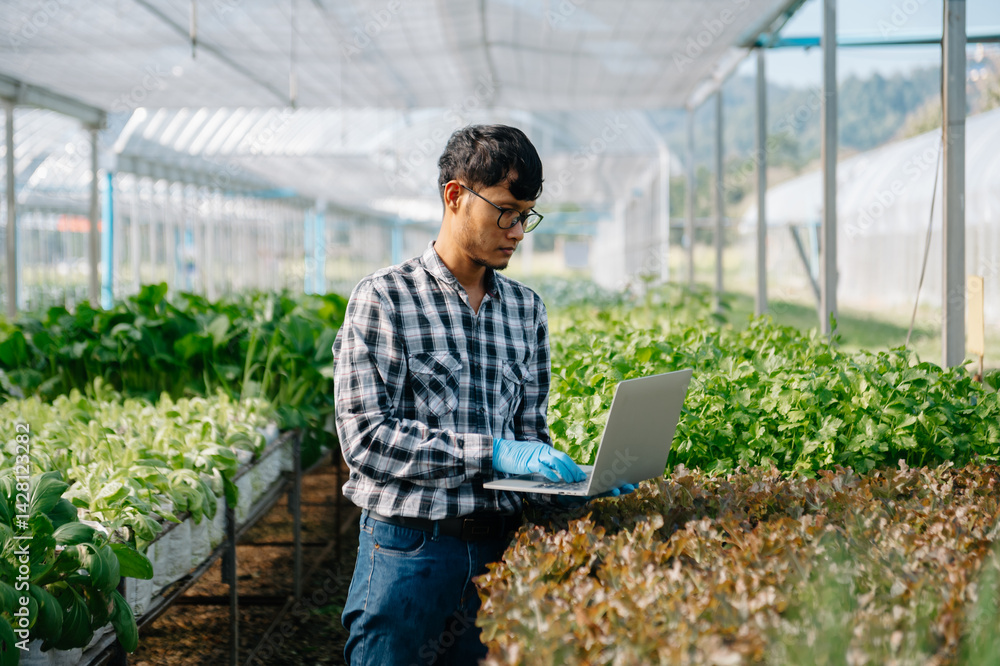 Asian farmer using hand holding tablet and organic vegetables hydroponic in greenhouse plantation.