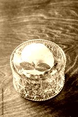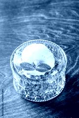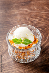 : A beautifully presented dessert featuring a scoop of creamy vanilla ice cream atop a layer of crumbly cake, garnished with fresh mint leaves, served in an elegant glass dish.