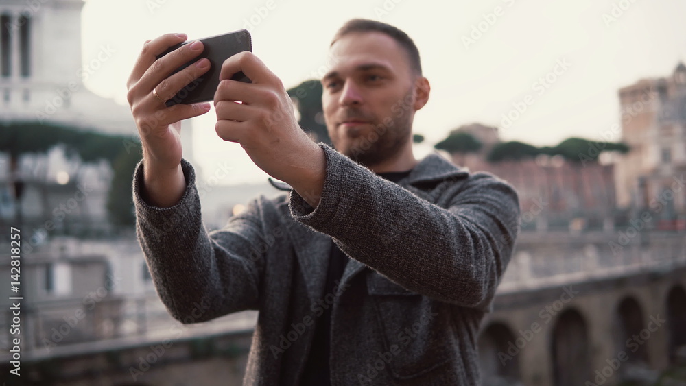Man tourist explores new city, takes selfie photos of city centre on the smartphone. Male enjoys trip to Rome, Italy.