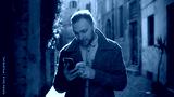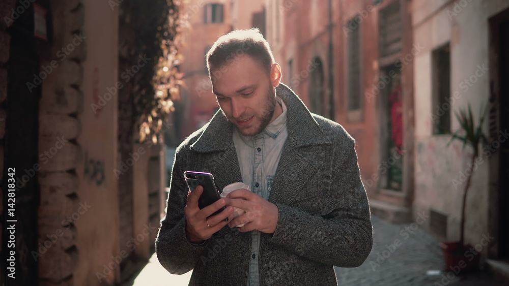 Young attractive man walking in city and using smartphone. Male chatting with friends and drinking coffee.