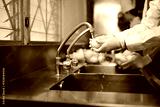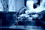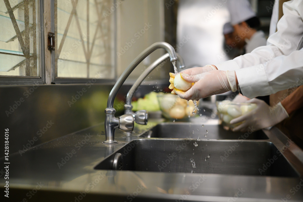 Aspiring chefs washing fresh vegetables at a stainless steel sink