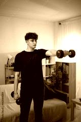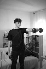 Young man doing a strength training exercise with dumbbells in a living room