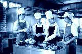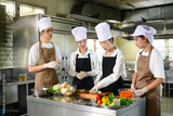 Group of young chefs in training focused on cutting vegetables during a cooking class
