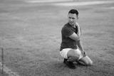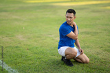 An asian man in blue t shirt is touching his shoulder and looking away while kneeling on grass field
