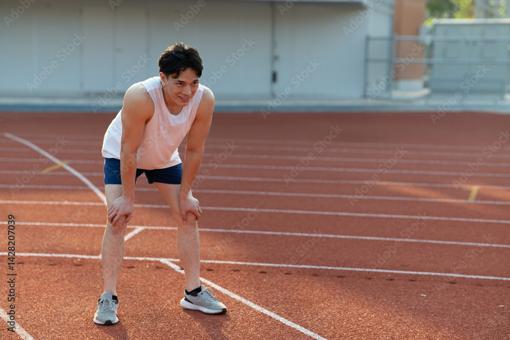 Asian man in white tank top looking ahead while standing with hand on knee, take a rest after run.