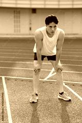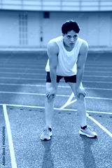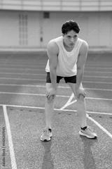 Full body of asian man in white tank top standing with hand on his knee, taking a rest after running