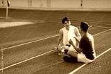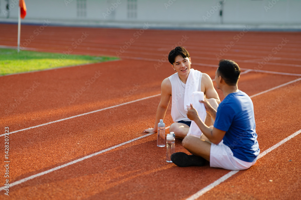 Two asian athlete men sitting and talking together on racetrack in sports stadium. Taking a rest.