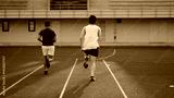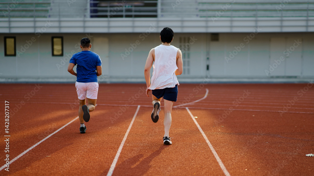 Two asian athlete men or male friends are running together on the racetrack in sports stadium.