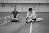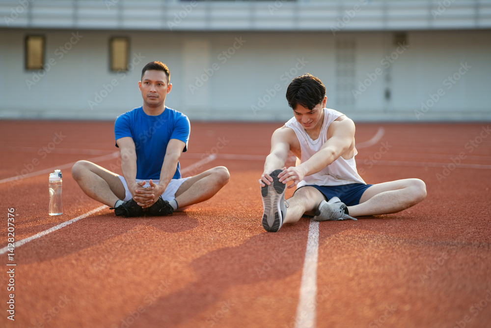 Two asian athlete men stretching their foots together, sitting on the racetrack in sports stadium.