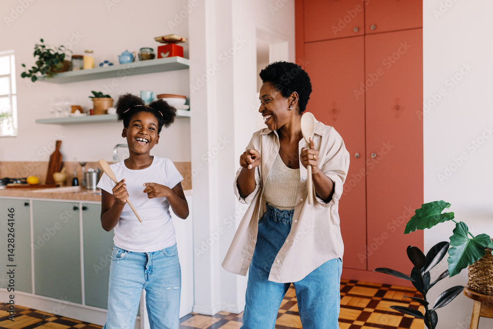Joyful mother and daughter singing and dancing at home