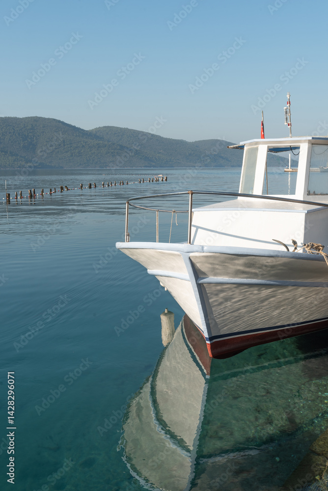Stunning view of a boat moored in the beautiful harbour of Turkish Riviera seaside town of Akyaka on the south west coast of Turkey