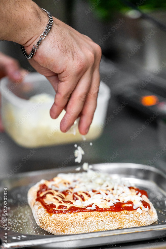 A chef's hand delicately sprinkles cheese over a freshly prepared pizza base topped with sauce, highlighting the art of pizza-making in a vibrant kitchen setting.