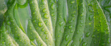 Fresh green leaf with raindrops. The texture of the leaf with veins and water drops. Ecology. Many drops of morning dew. Dew closeup. Natural background. Water drops