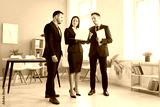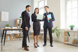 Office diverse business employees discussing at laptop, friendly busy team colleagues standing in modern room thinking marketing project, businesspeople working together during professional meeting