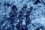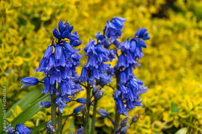 Bright Spanish Bluebell flowers against yellow foliage on the background