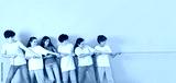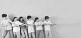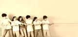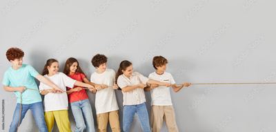 Diverse happy teen group team of cheerful classmates holding rope, playing tug of war, compete on common project enjoy laughing, kid team building activity, having fun enjoying activity playing to win