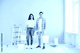 Positive portrait of a happy young family couple renovating new home together. They are painting and decorating, showing joy and collaboration in construction and home improvement.