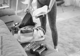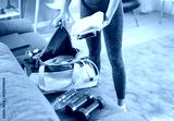 Cropped photo of sporty woman packing gym bag for sport exercising. Young athlete girl in gray sportswear preparing stuff for training for active day. Wellness and healthy lifestyle concept.