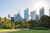Cityscape with sun over the skyscraper and tropical park