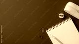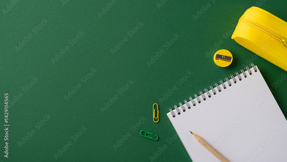 Stationery items including a notebook, pencil, and more placed over a green surface