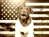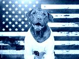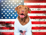 Cute dog and American Flag background. Patriotic greeting card. Smile dog. Closeup, indoors. Studio shot. Congratulations for family, loved ones, relatives, friends and colleagues. Pets care concept