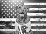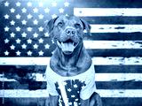 Cute dog and American Flag background. Patriotic greeting card. Smile dog. Closeup, indoors. Studio shot. Congratulations for family, loved ones, relatives, friends and colleagues. Pets care concept