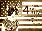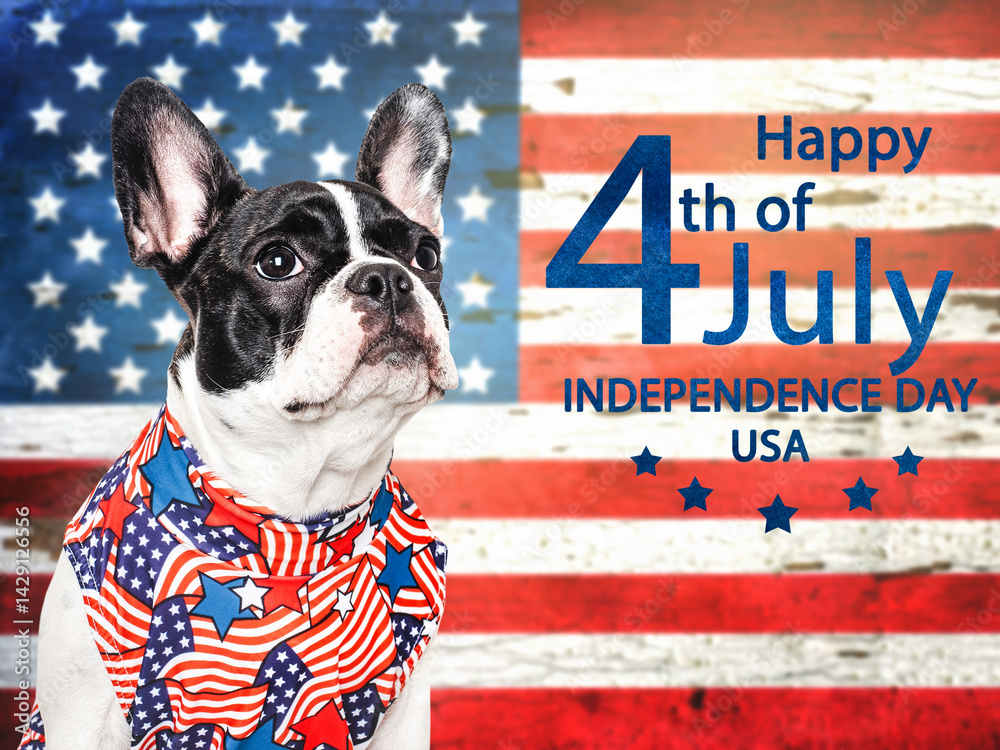 Happy Independence Day. Cute puppy and American Flag background. Patriotic greeting card. Serious dog. Closeup, indoors. Studio shot. Congratulations for family, friends, colleagues. Pet care concept