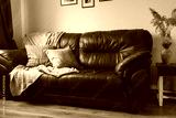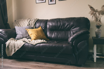 Closeup of luxurious expensive old brown leather couch with pillows and plaid at home interior