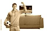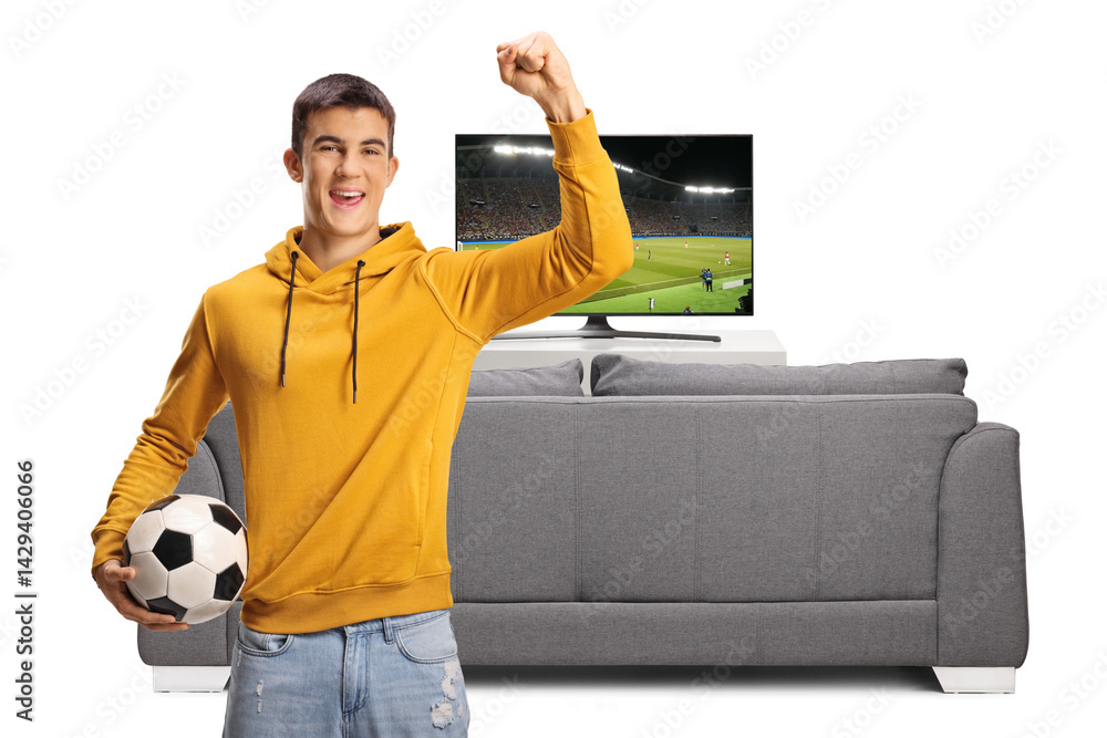 Happy young man with a football cheering, football match on tv