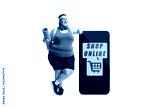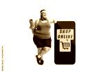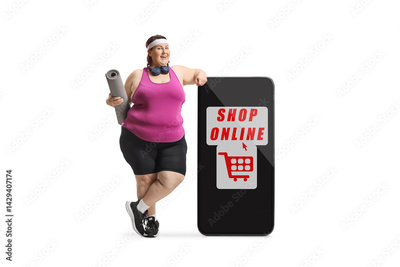 Overweight woman in sportswear leaning on a smartphone with online shopping app