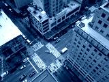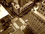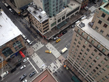 Looking down on New York Street from above in tall Manhattan skyscraper. Bird's eye view of midtown Manhattan street 5th Avenue. Yellow taxis driving down New York City street. People crossing street