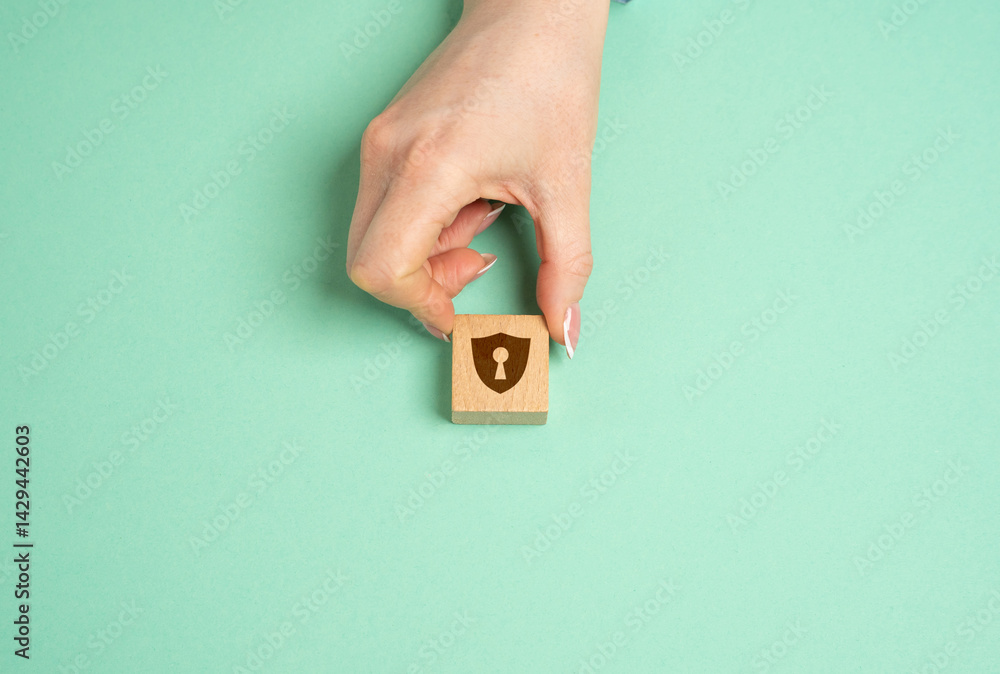 The hand places a figurine with a shield with a keyhole. Concept of protection and security. Secrets. Privacy, data security, and safeguarding secrets.