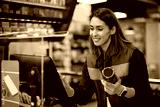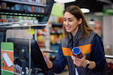 Happy female cashier working at store cash register.