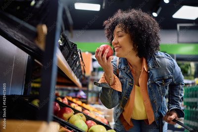 Happy woman smelling fresh apples while buying fruit in supermarket.