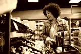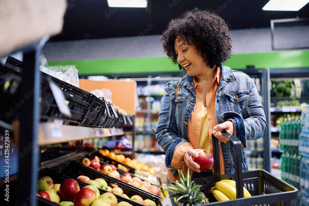 Happy woman taking apple while shopping fresh fruit at grocery store.