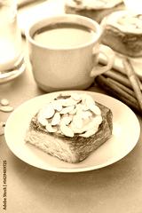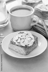 Cinnamon roll topped with cream cheese frosting and sliced almonds served with coffee