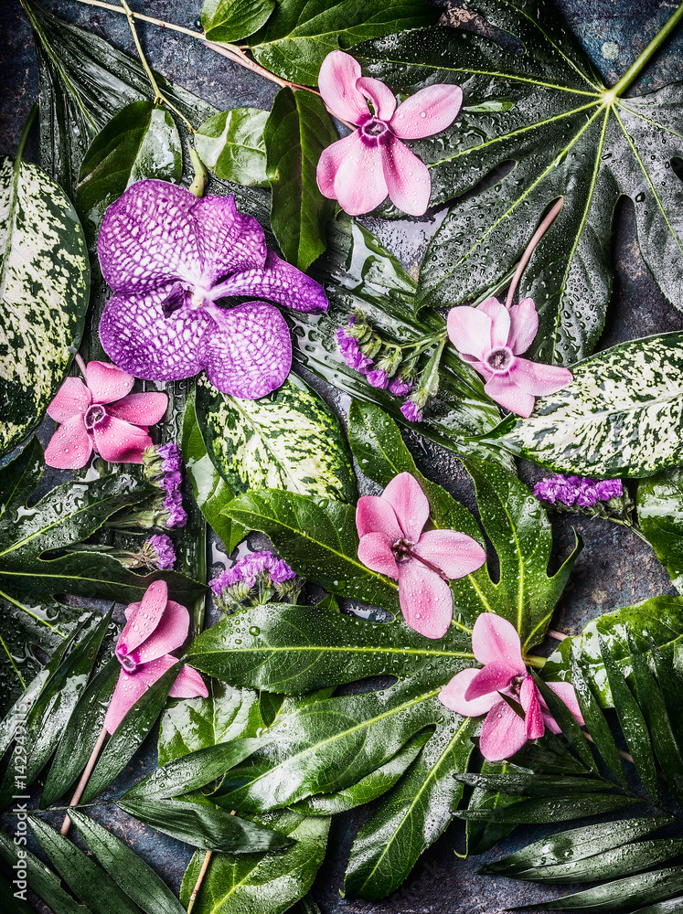 Creative tropical nature background with various palm and jungle leaves and purple flowers, top view. Exotic plants concept