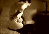 Menstruation symptom concept, Close-up woman touching her belly and feeling stomach pain from cycle period on the bed at home.