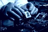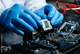 The technician is putting the CPU on the socket of the computer motherboard. electronic engineering electronic