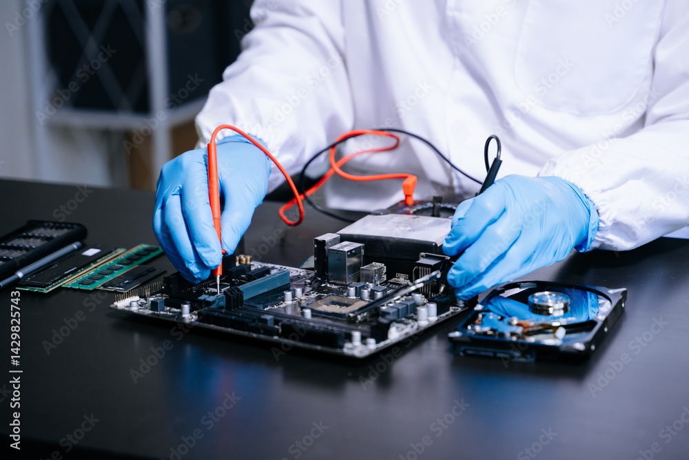 Electronics technician, electronic engineering electronic repair, electronics measuring and testing, repair and maintenance concepts.uses a voltage meter to check