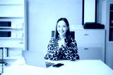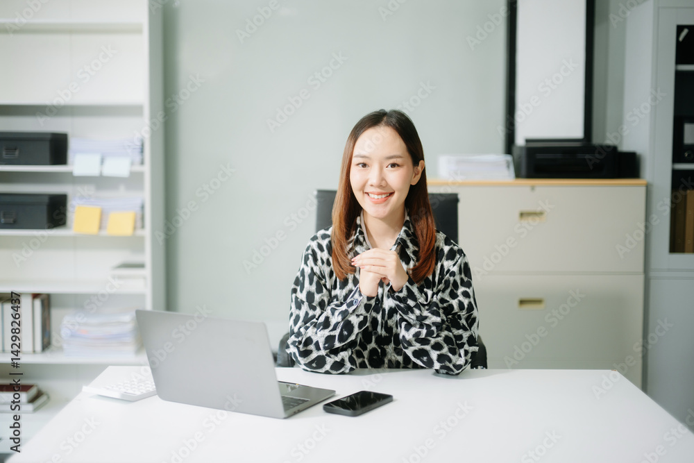 Asian businesswoman using a laptop, smiling and looking at camera while sitting at office
