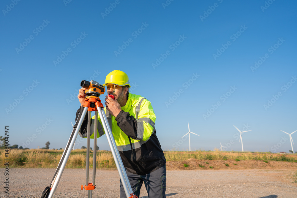 Engineer wearing uniform inspection and survey work in wind turbine farms rotation to generate electricity energy. Maintenance engineer working in wind turbine farm at sunset.