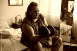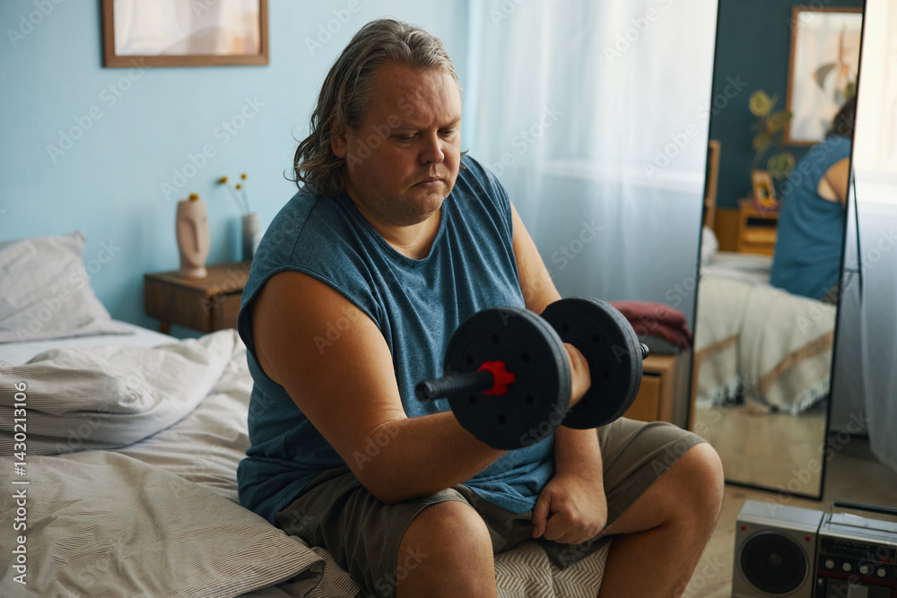 Portrait of man lifting dumbbells in his bedroom, demonstrating commitment to fitness and strength training