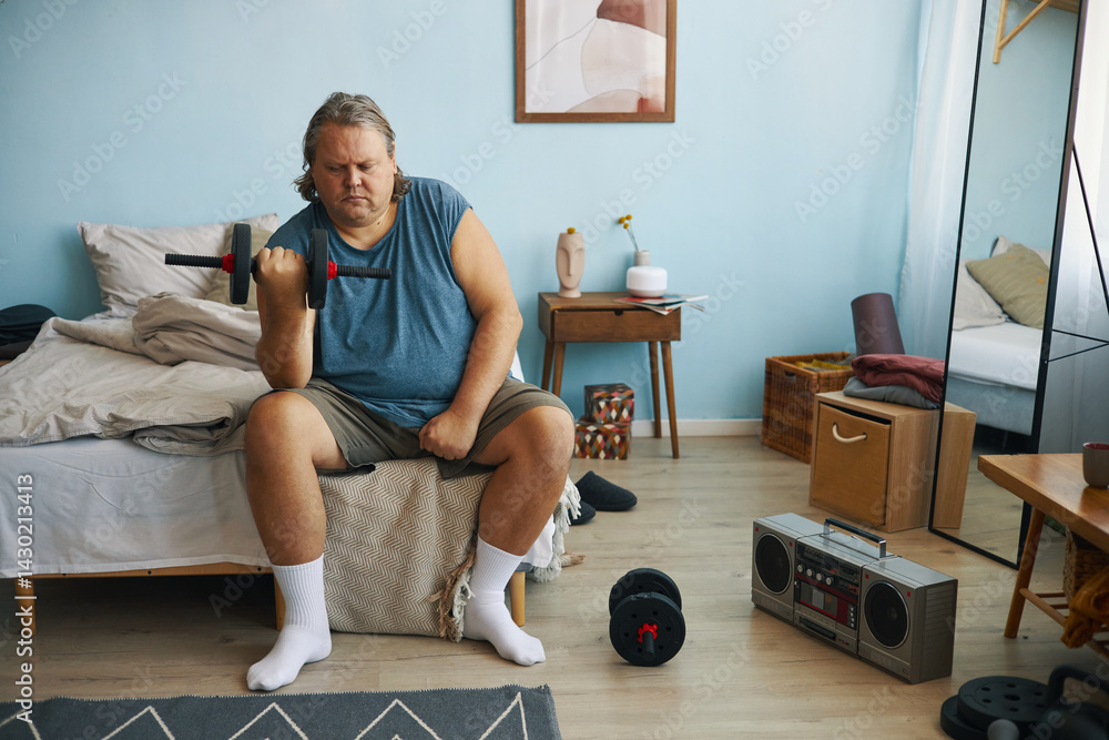 Middle-aged man lifting dumbbells while sitting on bench near bed in home environment
