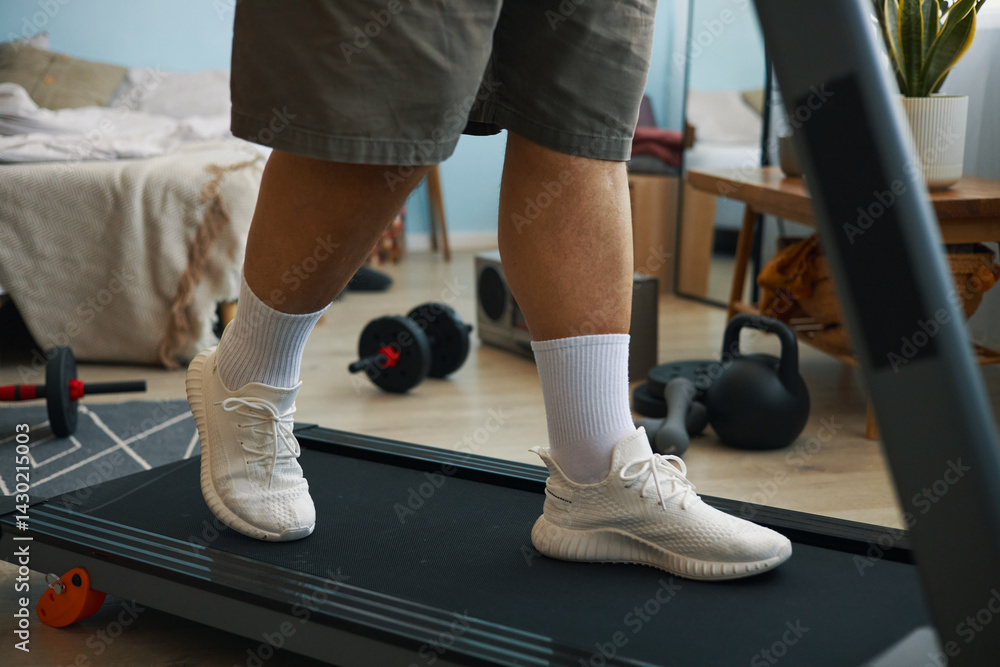Image showing person's lower body while walking on treadmill in home gym. Various weights and exercise equipment scattered