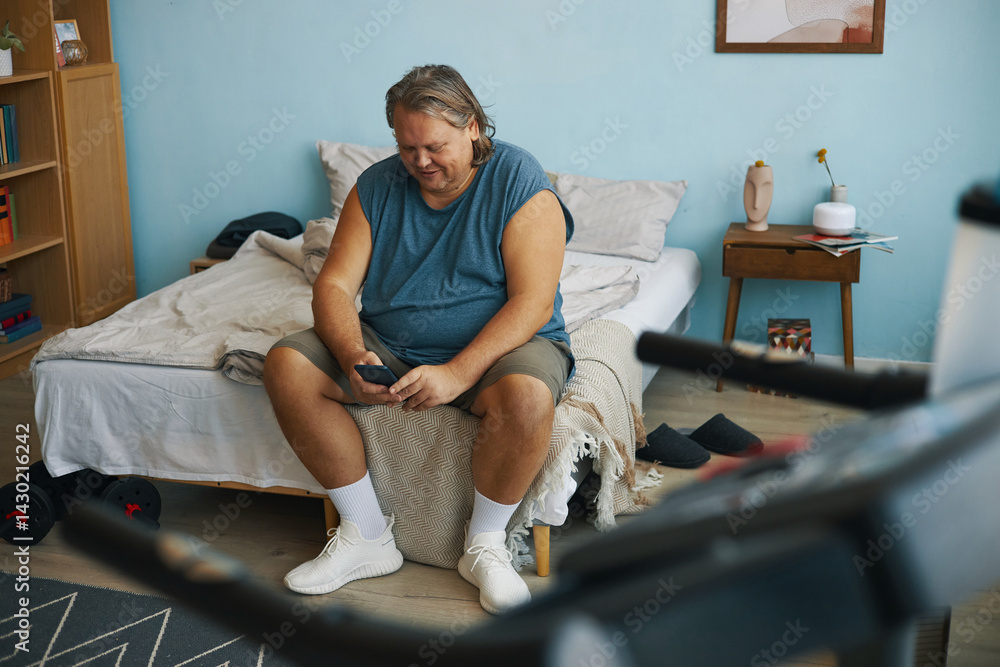 Man in sleeveless shirt and shorts sitting on bed while preparing for exercise
